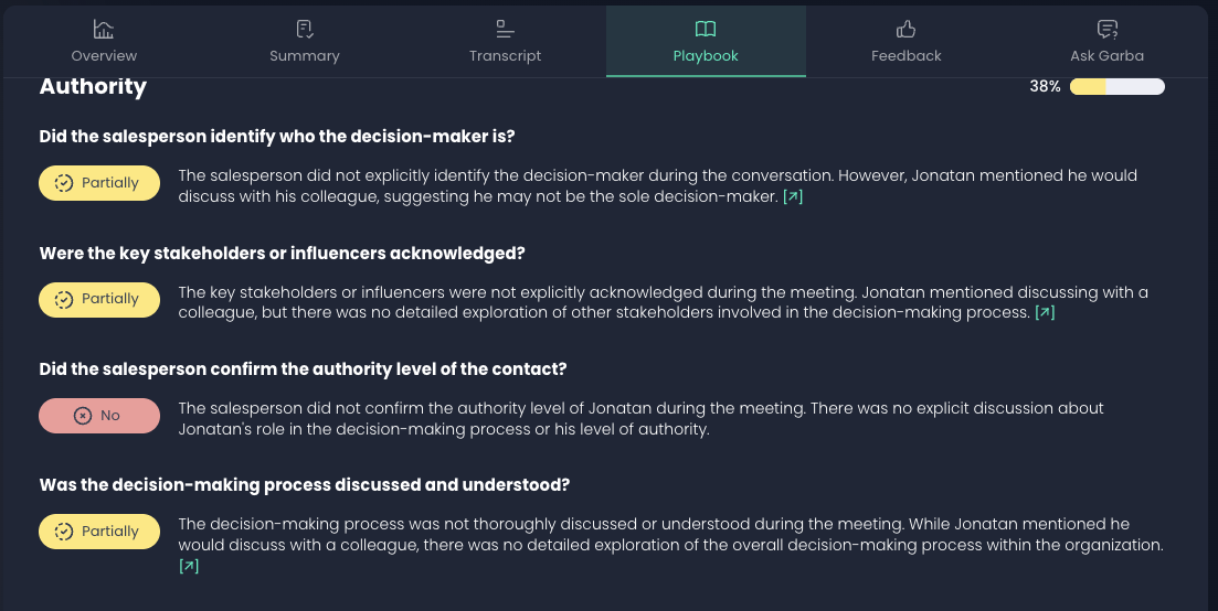 Set up your playbook (e.g., MEDDPICC) and get instant feedback on how well you followed your process.