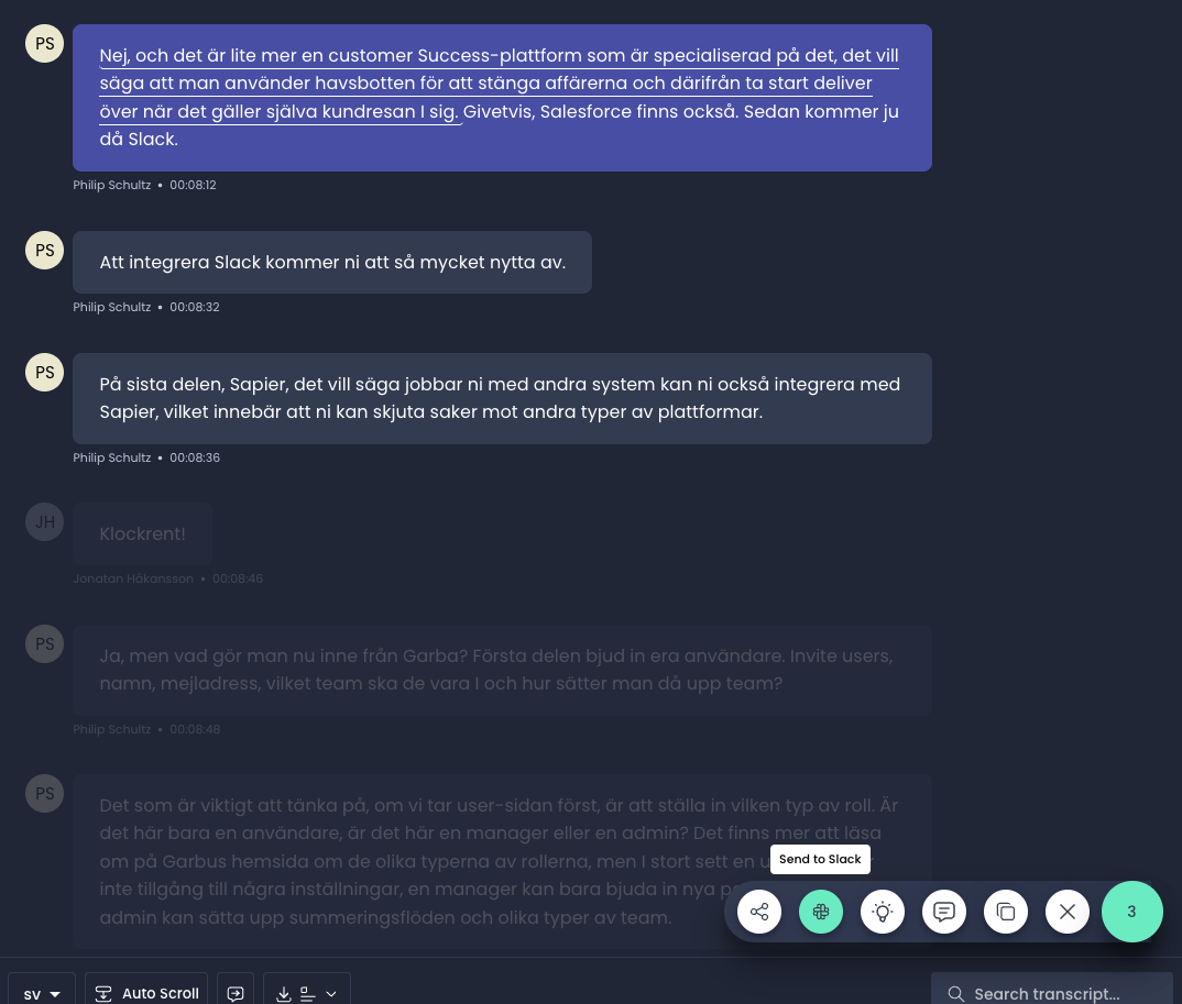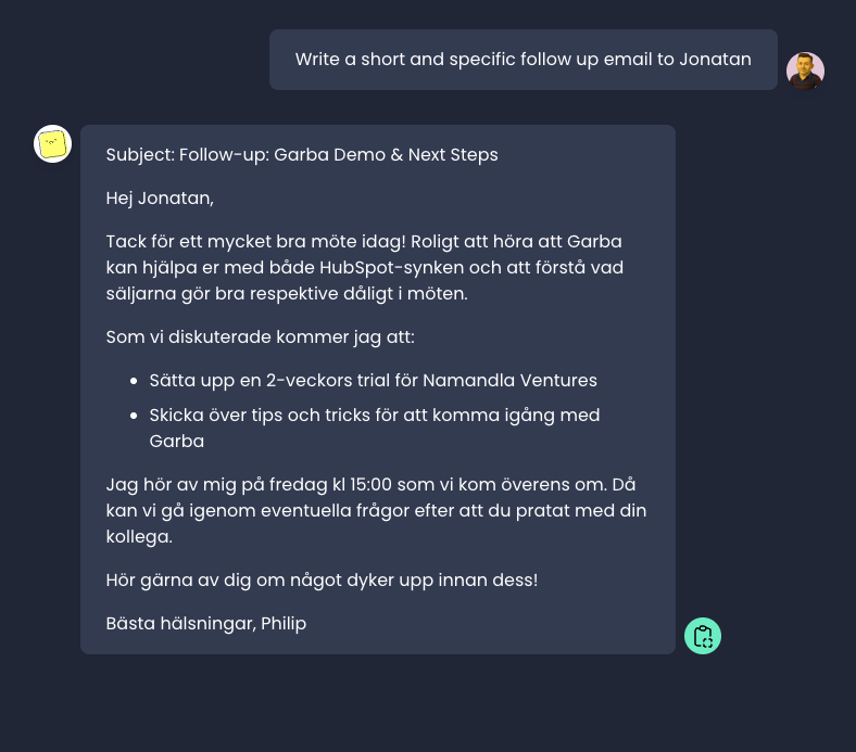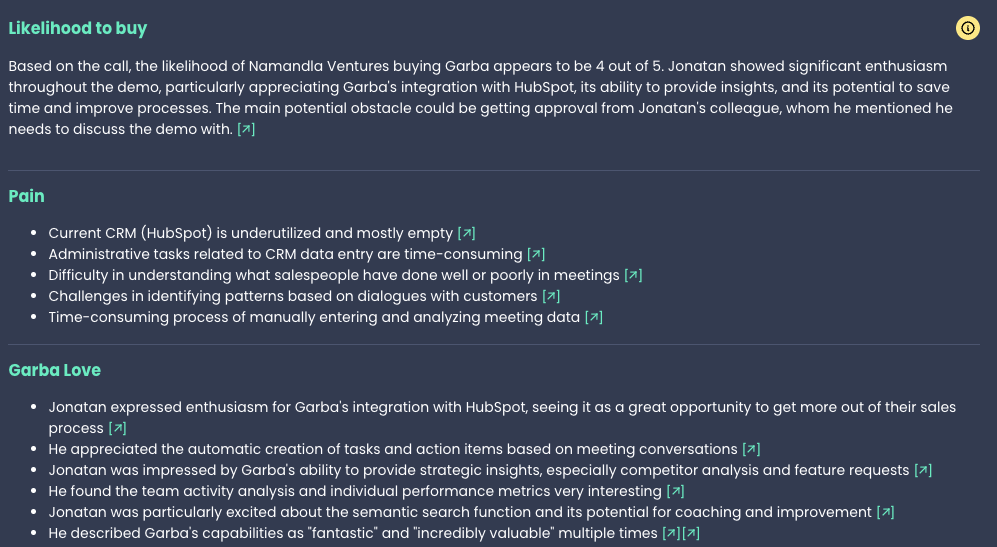 Out of the box, Garba gives you a clean summary of what was discussed. But the real power is customization: you can configure Garba to extract any insight from any type of call, fully tailored to your sales process.