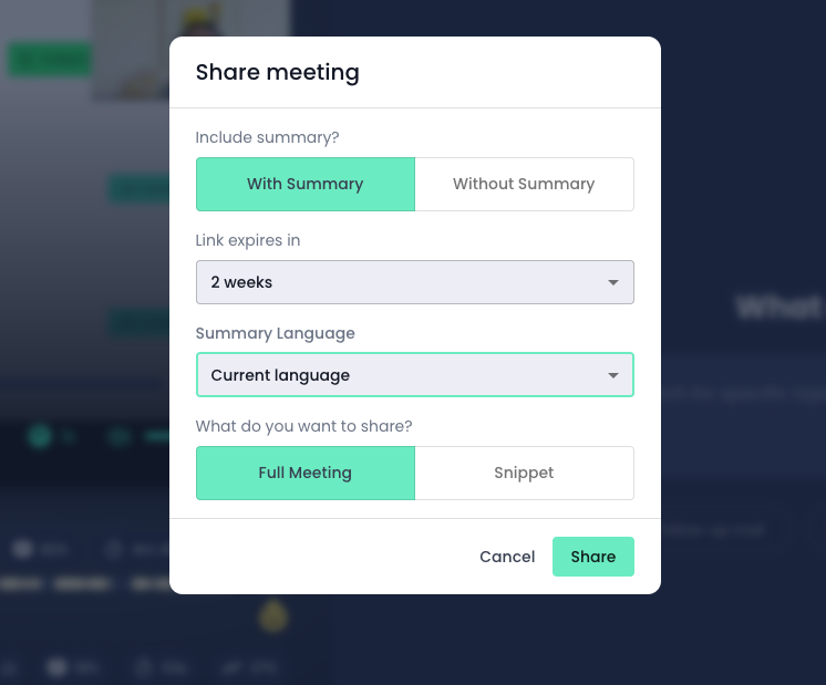 Highlight text, create snippets, and share specific moments or the entire meeting with just a click.