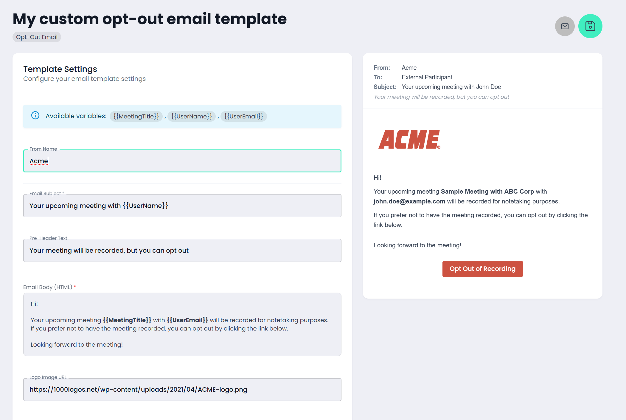 Garba lets you fully customize the branding and messaging in your opt-out emails. You can create a single template that applies to the entire account or set unique templates for individual teams.