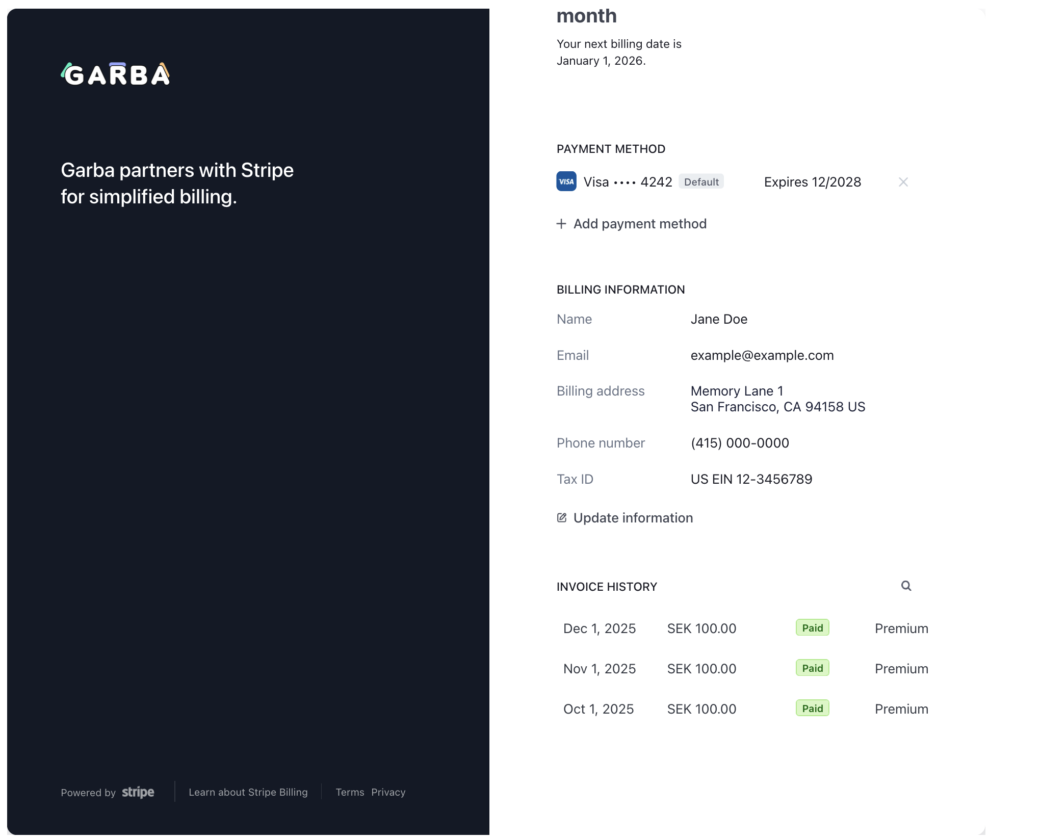 To view and manage your subscription information, navigate to https://app.garba.ai/setup/account-billing. If you are paying by card, you see a button called “View billing at Stripe”. Click on it to access your payment details.