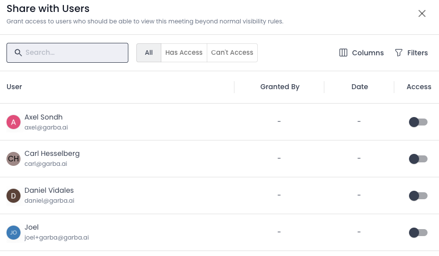 Garba lets you control access at the individual meeting level, so only the right people can view and use meeting content.